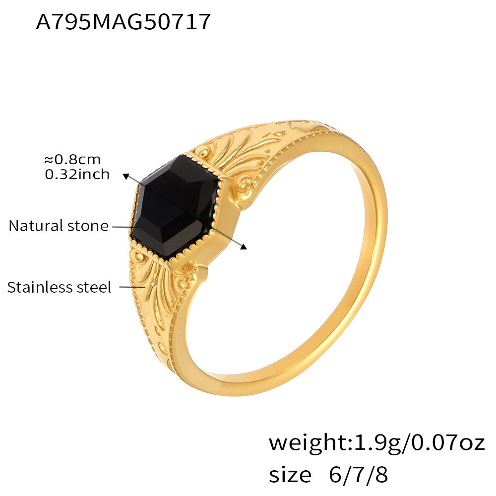 Stainless Steel Electroplated Patterned Vintage Ring With Black Natural Stone Inlay